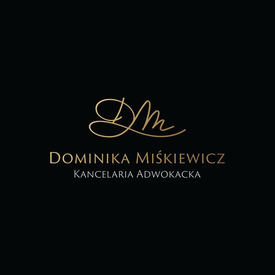 Elegancki monogram DM w złotej kaligraficznej czcionce na tle głębokiej czerni. Prestiżowa identyfikacja wizualna emanująca elegancją i szlachetnością tradycji prawniczej.