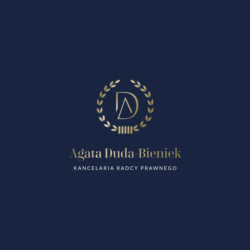 Logo dla radczyni prawnej. Budujące zaufanie logo ujęte w złoty wieniec laurowy na granatowym tle. Elegancka identyfikacja wizualna łącząca klasyczny profesjonalizm ze szlachetnością i symboliką zwycięstwa.