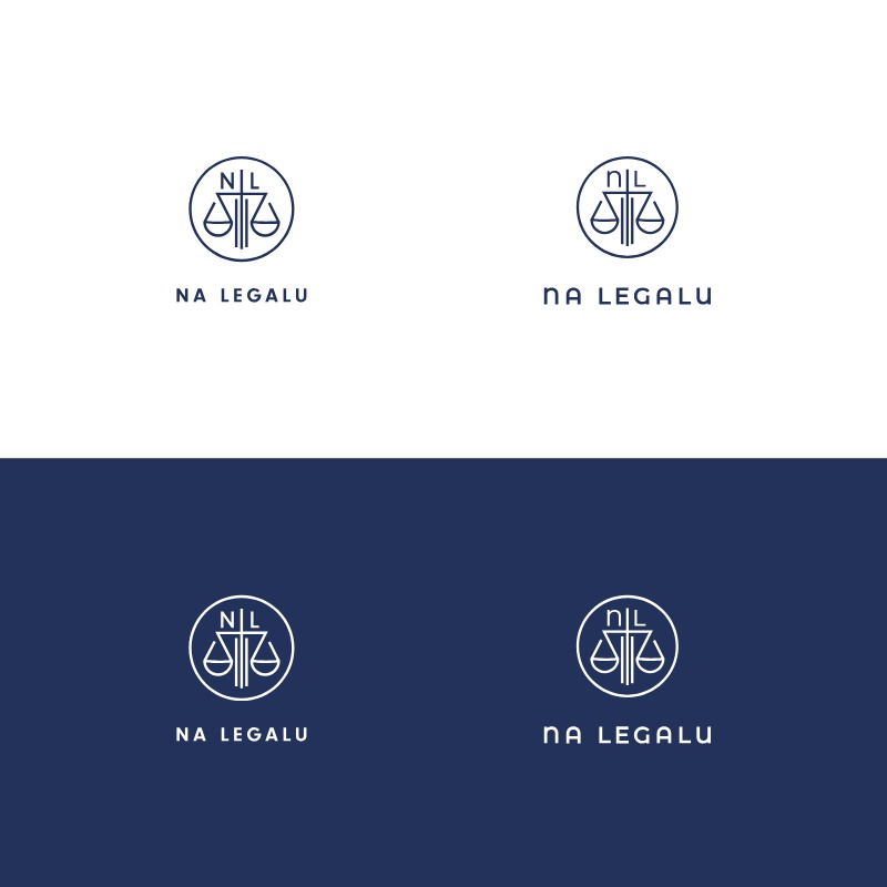 Logo dla prawnika Na Legalu. Geometryczna waga sprawiedliwości z wpisanym monogramem NL, zamknięta w doskonałym okręgu. Harmonijne połączenie granatu i bieli, emanujące profesjonalizmem i stabilnością.